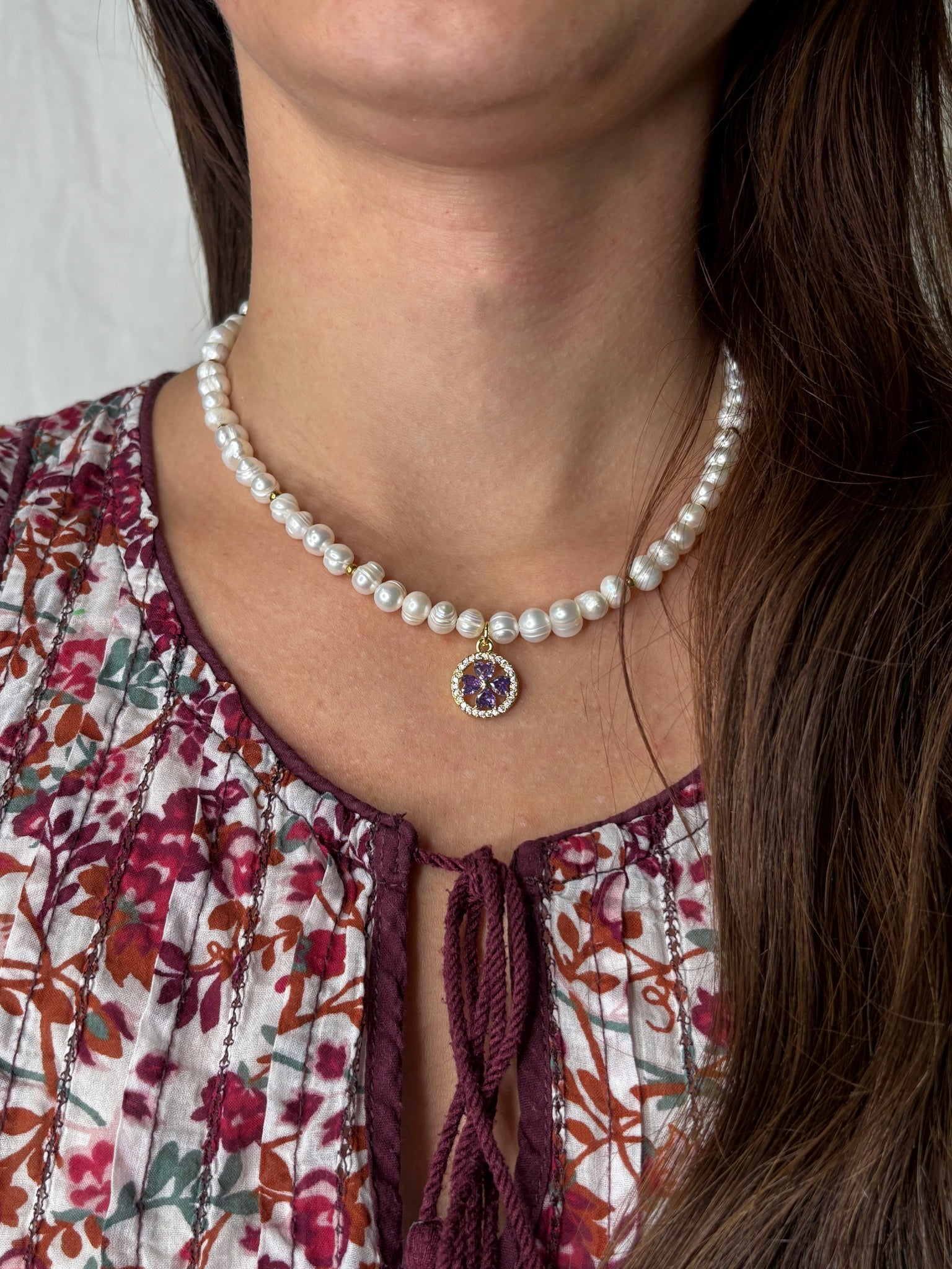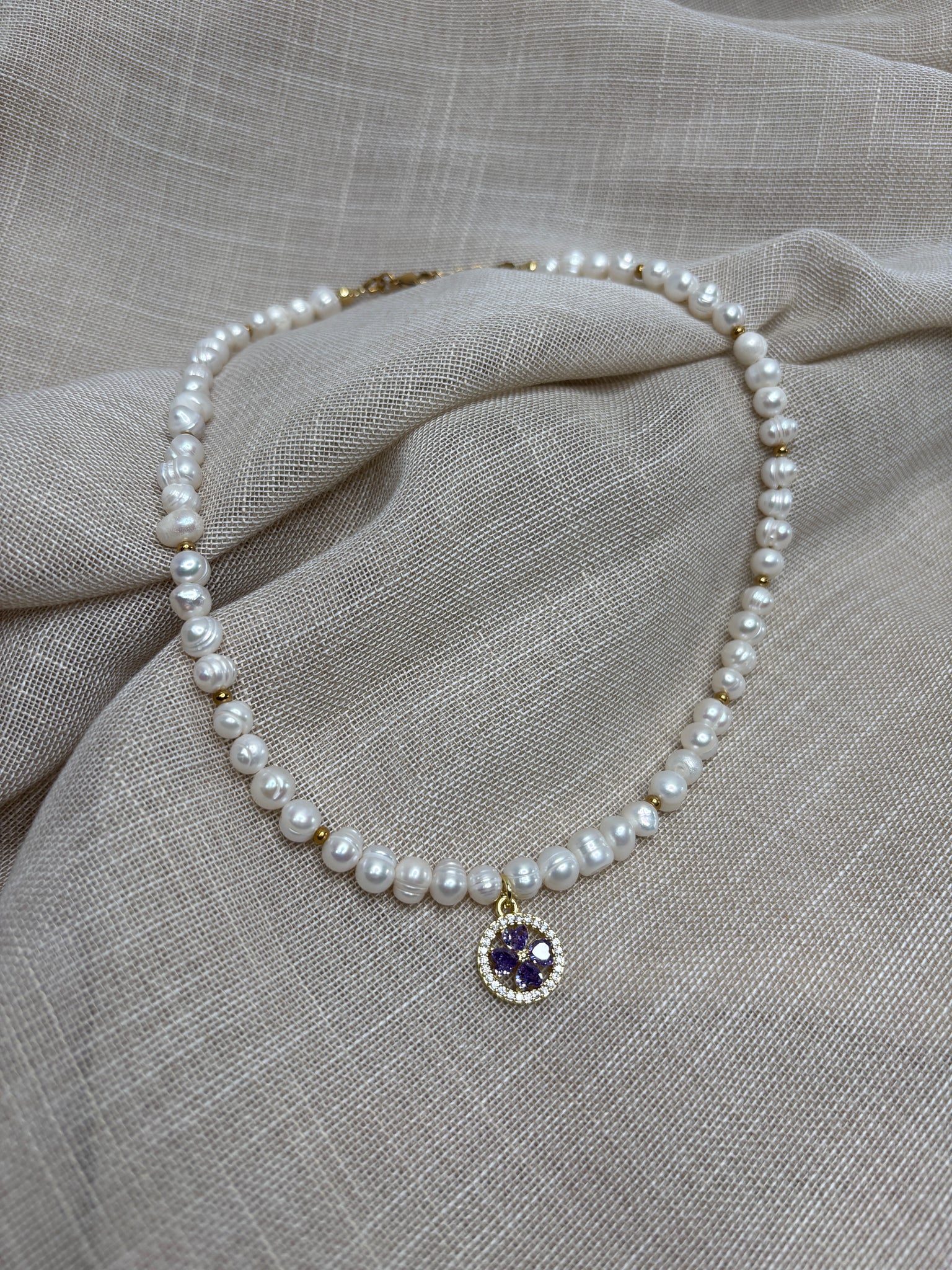 🌿 Spojenie prírodnej krásy a spirituálneho významu. Tento ručne vytvorený náhrdelník z pravých riečnych perál je doplnený o pozlátené korálky a závesný prívesok s fialovým zirkónom, ktorý symbolizuje intuíciu, ochranu a vnútorný pokoj.