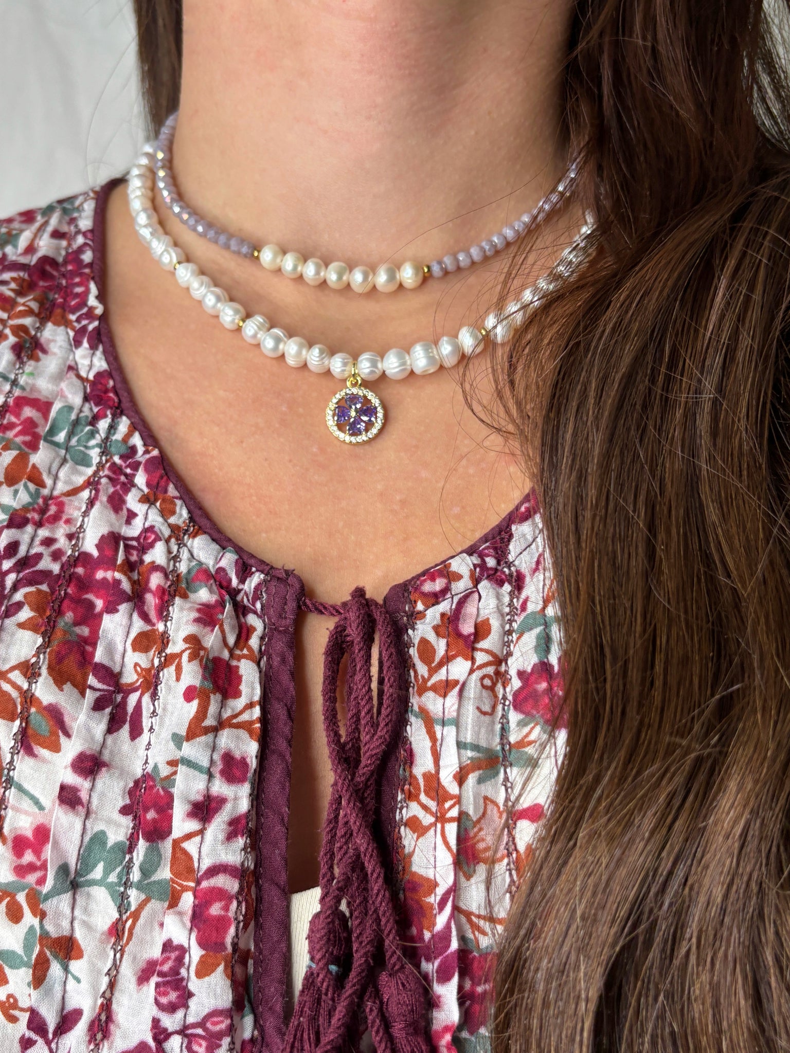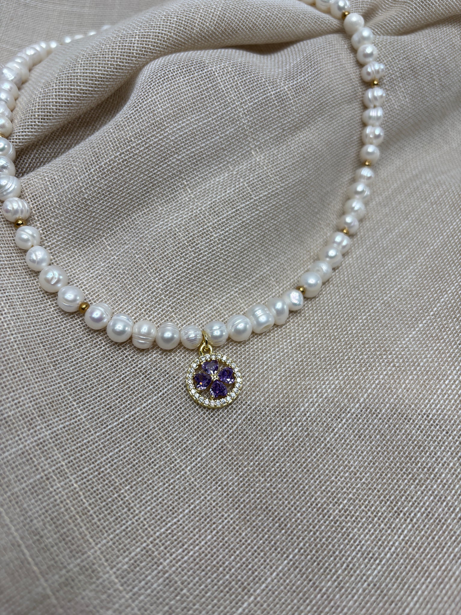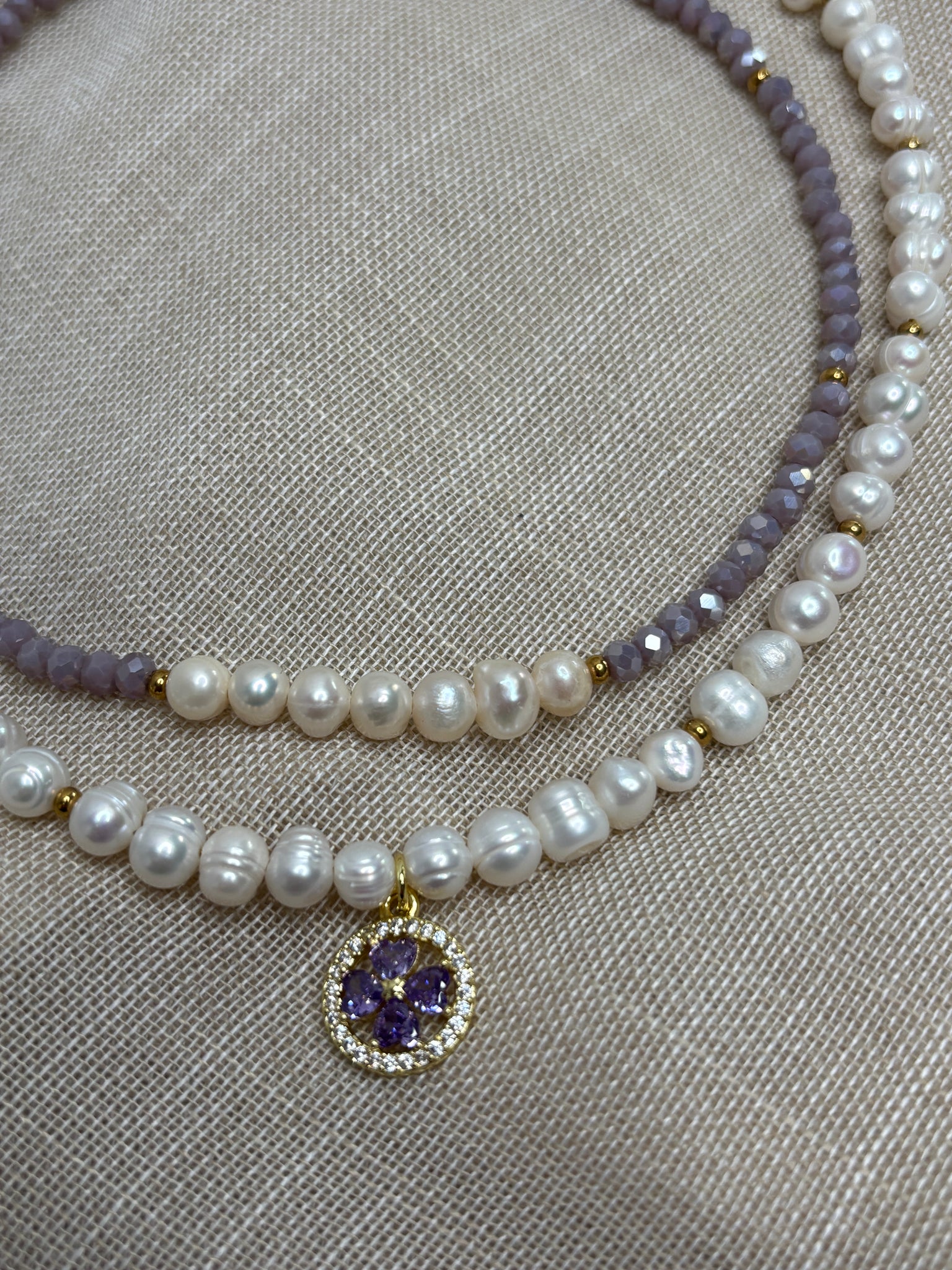 🔮 Fialový zirkón je kameňom duchovnej múdrosti, pomáha pri meditácii a podporuje rovnováhu medzi telom a mysľou. V kombinácii s perlami – symbolom čistoty a ženskosti – vzniká harmonický talizman, ktorý vás bude sprevádzať každý deň.