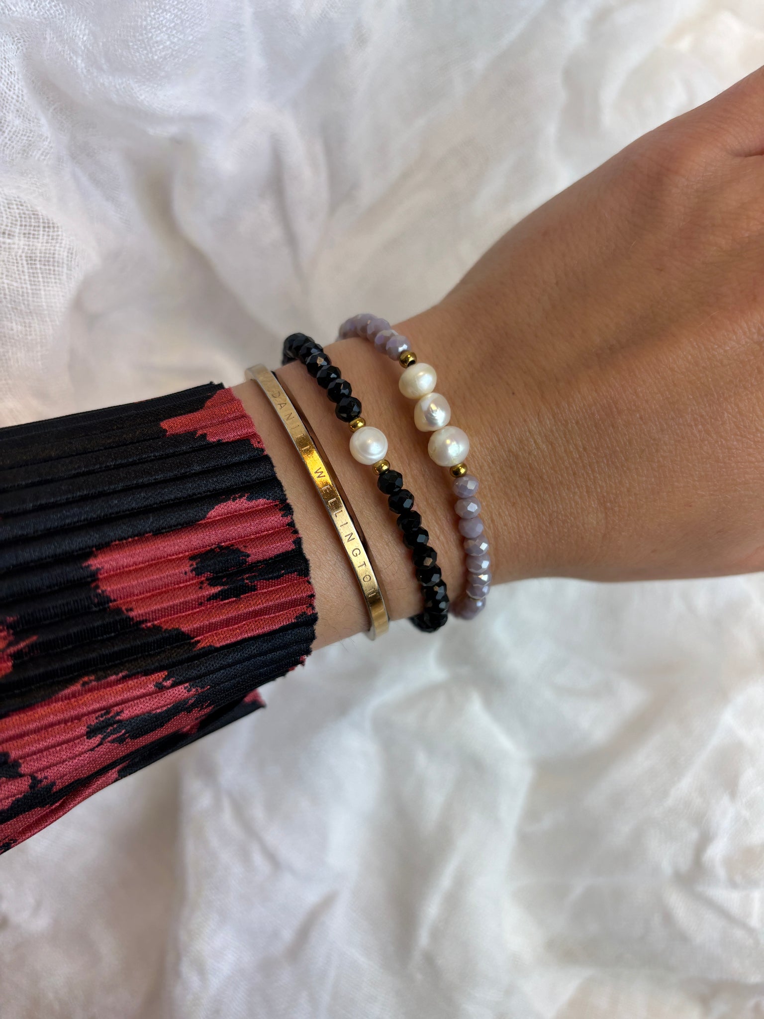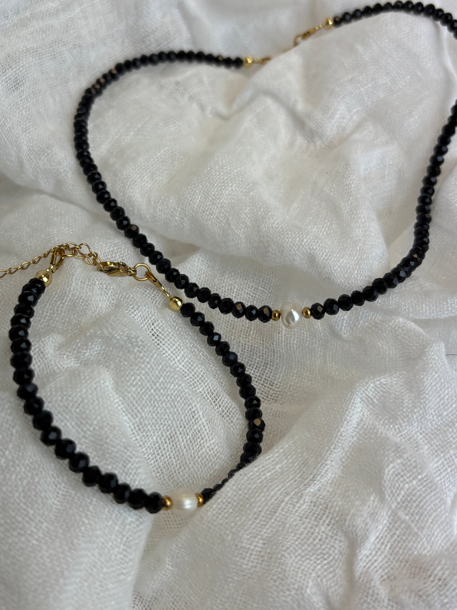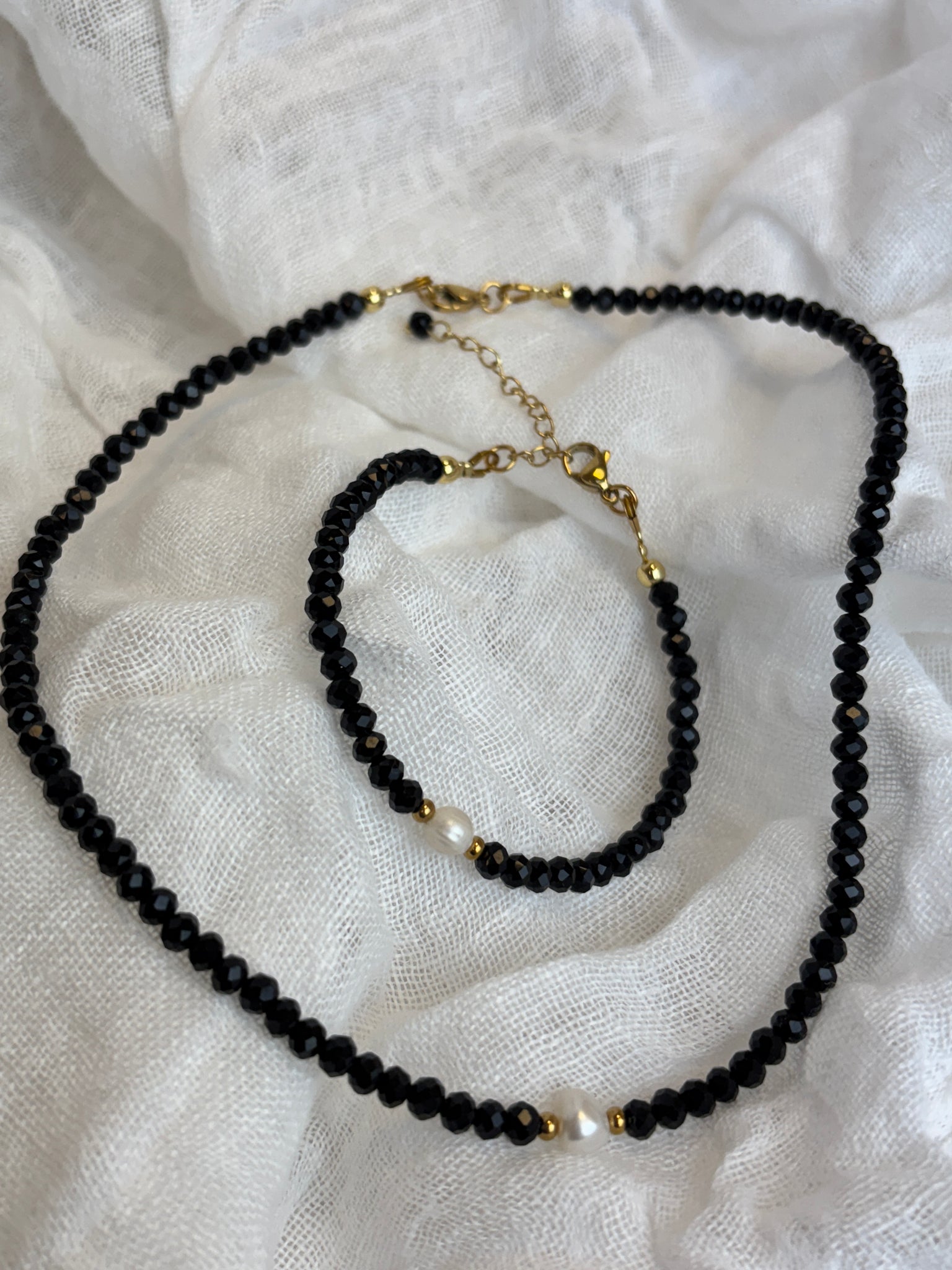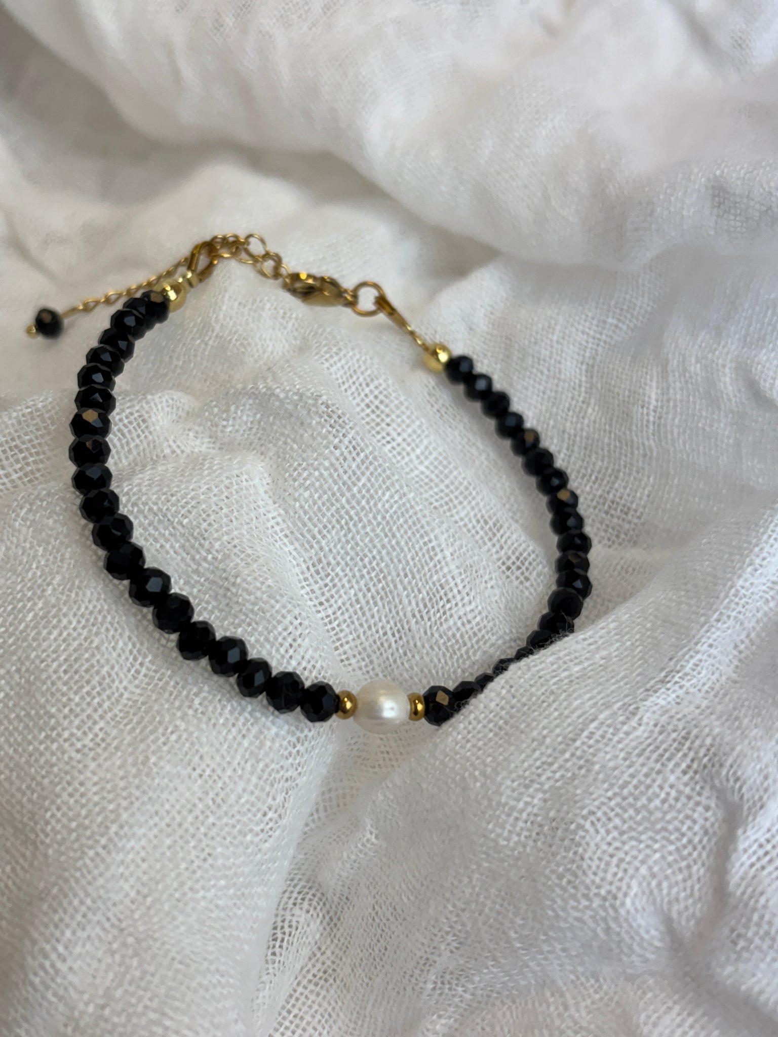 Jemný náramok, ktorý v sebe nesie spojenie nadčasovej riečnej perly a elegantného čierneho krištáľu. Zdobia ho pozlátené komponenty upravené IP metódou, vďaka čomu si dlho uchová svoj žiarivý vzhľad.