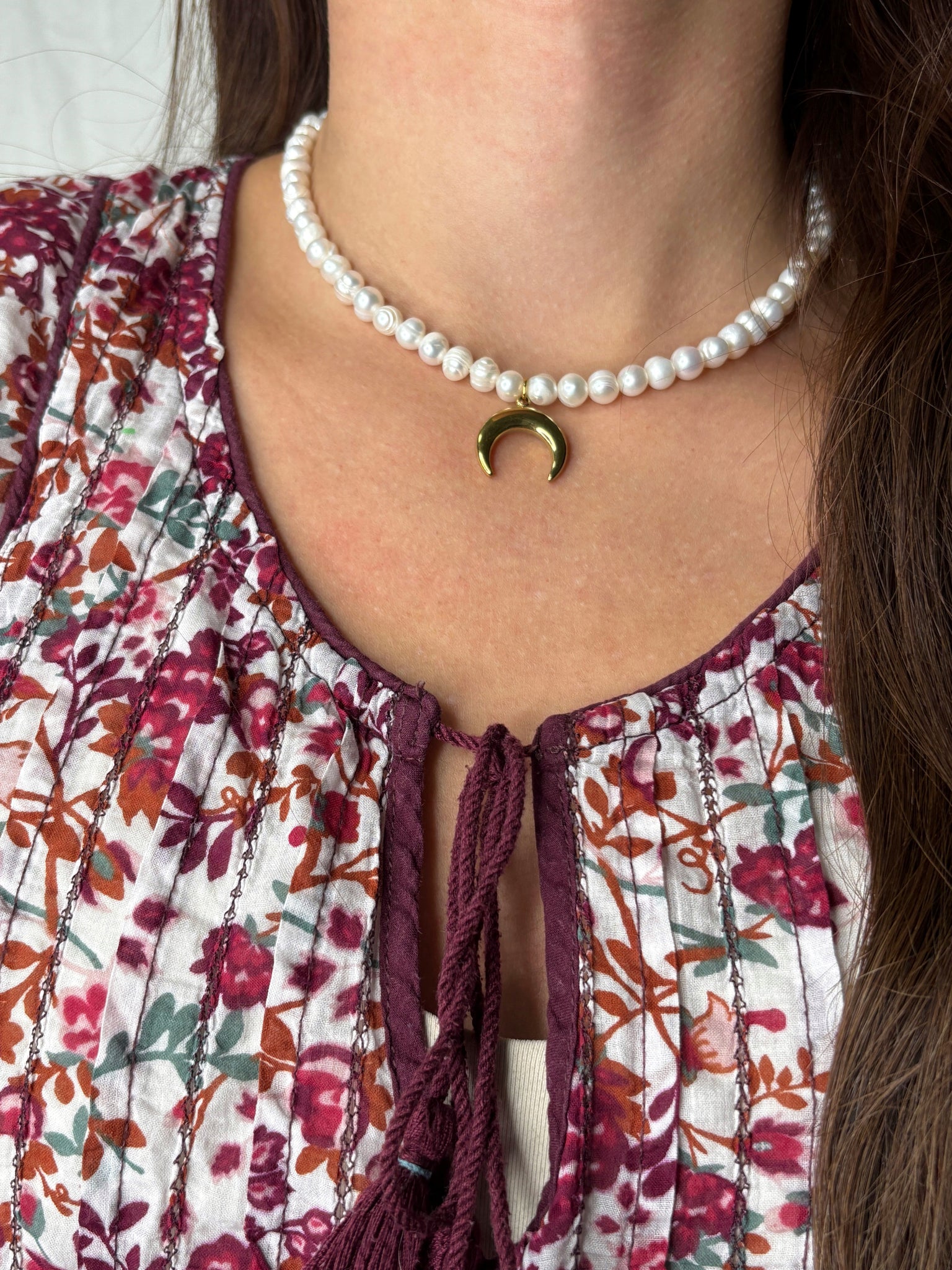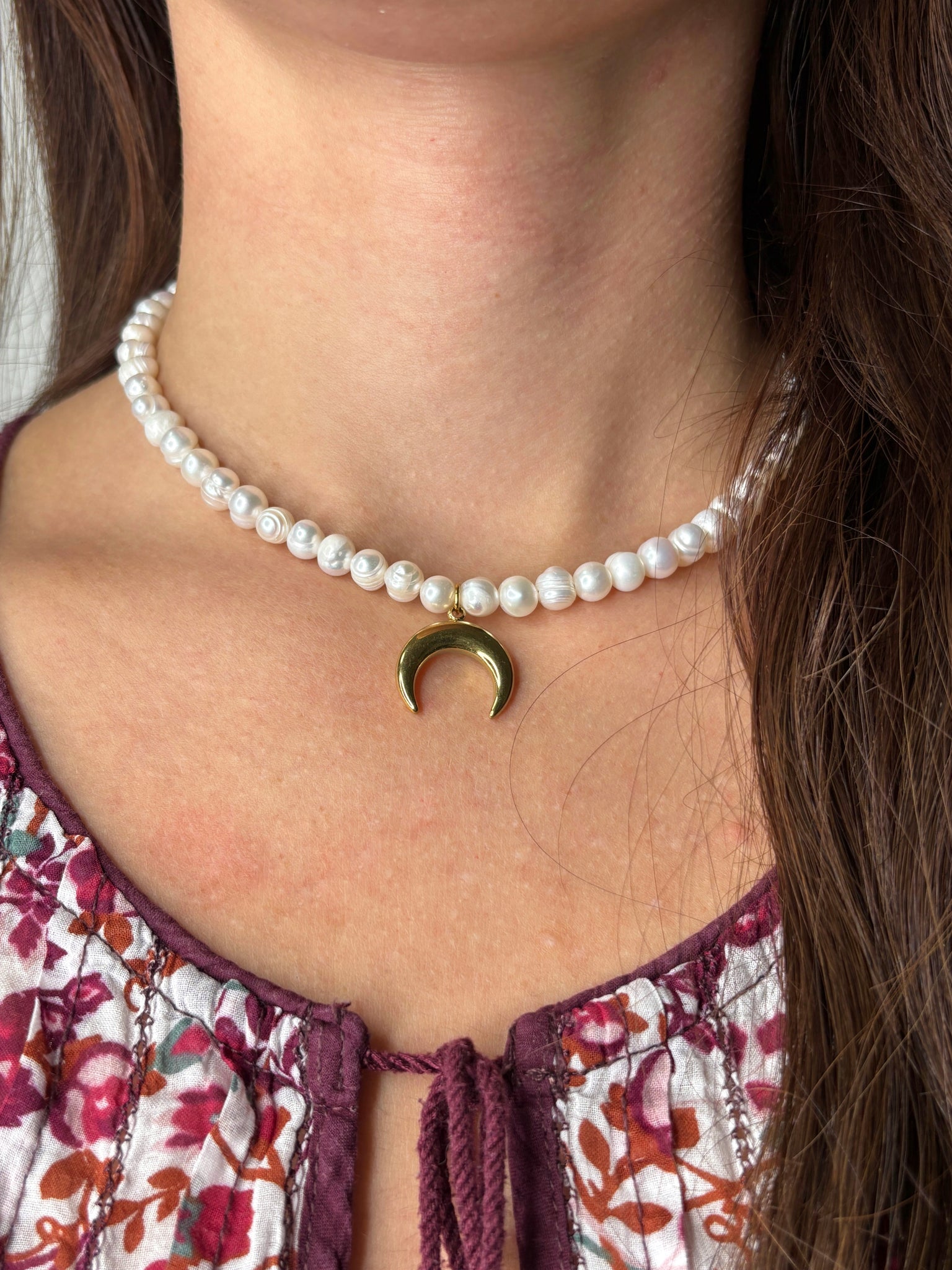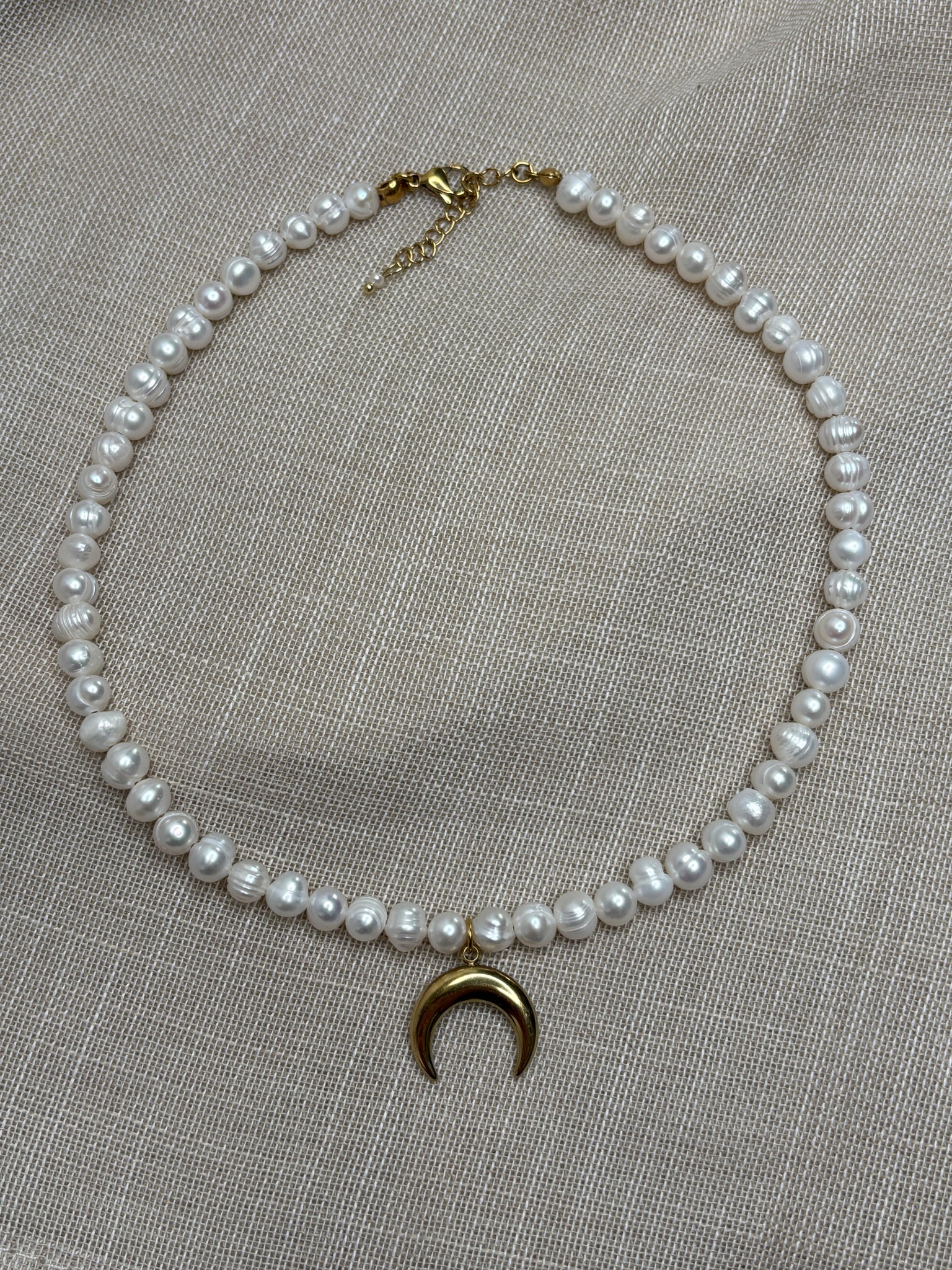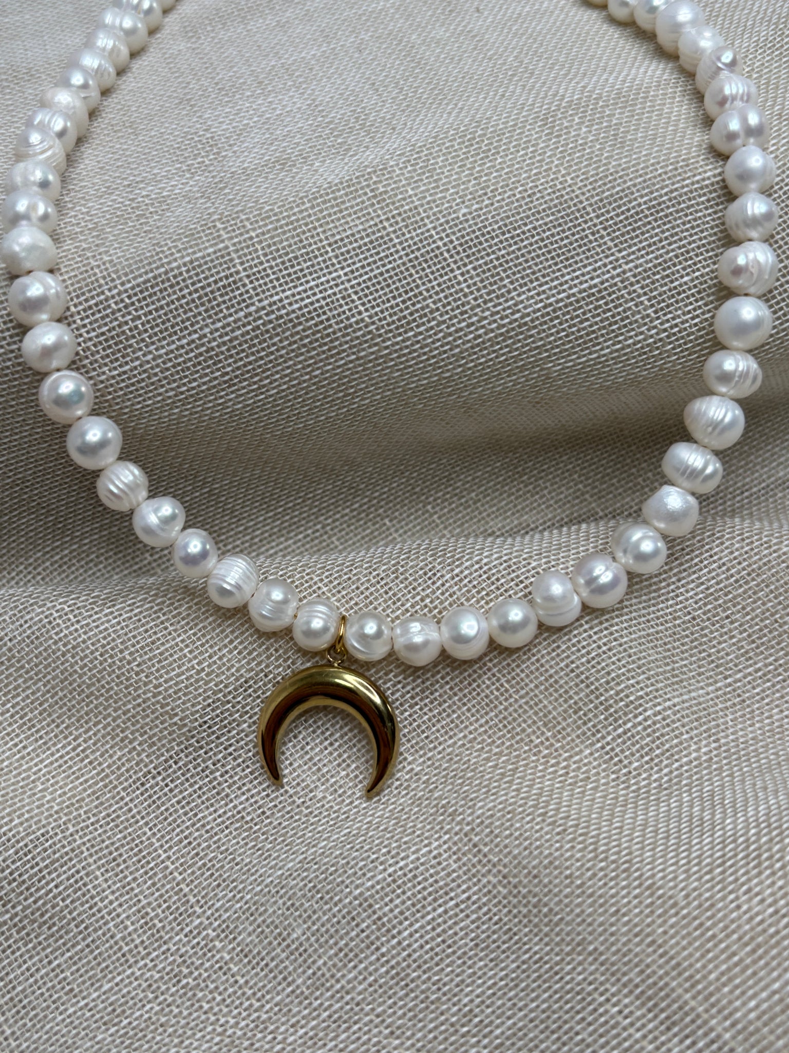 Nežné riečne perly nesú pozlátený prívesok mesiaca – pripomienku cyklickosti a sily, ktorá sa skrýva v každej fáze života.