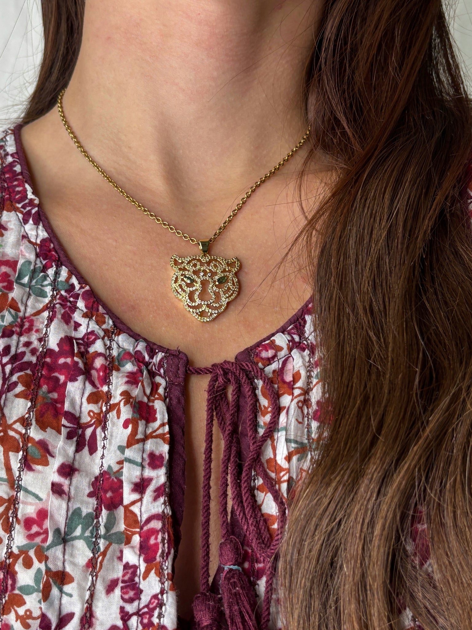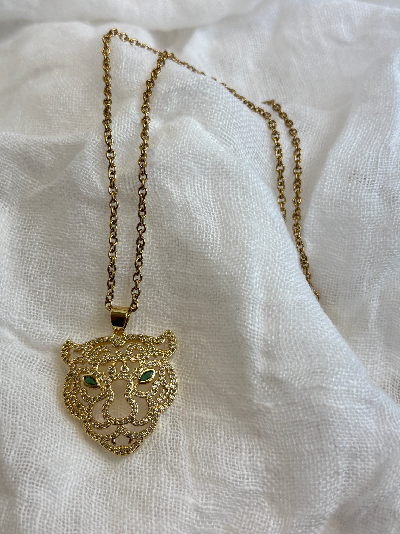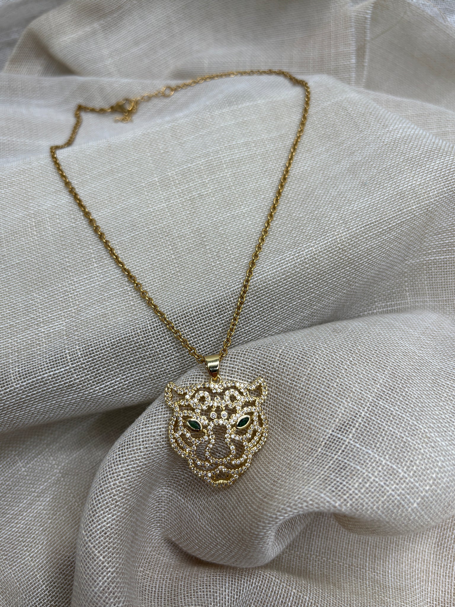 Elegantný náhrdelník s výrazným príveskom v tvare tigriej hlavy, ktorý zaujme na prvý pohľad. Prívesok je bohato zdobený trblietavými zirkónmi, pričom oči tigra sú zvýraznené zelenými zirkónmi. Tento šperk spája jemnosť detailov s výrazným dizajnom.